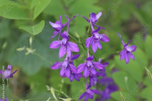 Vibrant Purple Larkspur Flowers Blooming in Summer Garden, Wild Delphinium on Green Foliage Background