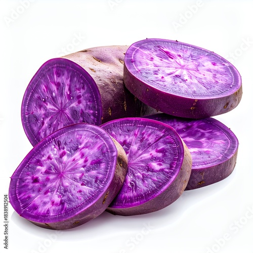 Vibrant Purple Sweet Potatoes Sliced on White Background.