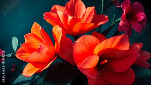 flower, floral, bloom, blossom, red, orange, vibrant, colours, nature, botanical, flora, garden, plant, beauty, fresh, delicate, closeup, macro, detail, dark background, contrast, high-coloured, bright, tropical, exotic, spring, summer, romantic, elegance, decoration, design, artistic