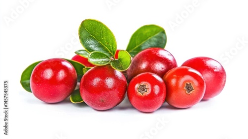 Vibrant red berries with green leaves on white background