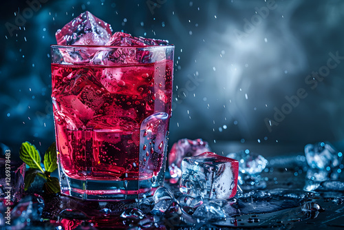 Vibrant red cocktail with ice cubes on moody background