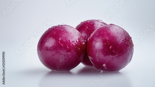 Vibrant Red Grapes: Three succulent, glistening red grapes, their skins glistening with droplets, form a delicious still life.