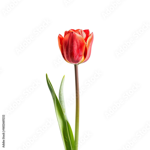 flower, tulip, red, orange, bloom, blossom, spring, nature, beauty, vibrant, colours, stem, leaf, green, isolated, closeup, detailed, image, photo, still life, single, elegant, garden, flora, plant, growing, studio, lighting, high-coloured, blood-red, texture, closeup, botany