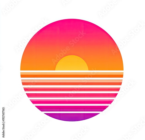 sunset, ocean, horizon, retro, vintage, 80s, 90s, aesthetic, graphic, design, circle, round, sphere, sun, sky, light, gradient, orange, pink, purple, yellow, magenta, fuchsia, violet, warm, cool, abstract, minimalist, simple, clean, geometric, line, stripes, sea, water, glow, shine, bright, colourful, high-coloured, vibrant, modern, digital, art, illustration, iconic