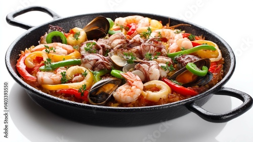 paella, seafood, dish, food, rice, shrimp, mussel, squid, octopus, clam, bell pepper, onion, saffron, cookery, epicure, meal, fresh, delicious, traditional, cooked, tasty, flavorful, ingredient, eatery, dinner, lunch, eating, gastronomy, culinary, holiday, celebration, gathering, festive, event, serving, table, closeup, healthy, nourishment, homemade, chef, preparation, rustic, pan, plate