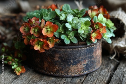 Vibrant seasonal flowers in a rustic container on a wooden surface