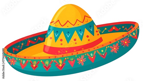 sombrero, hat, colourful, mexican, traditional, design, illustration, art, bright, vibrant, yellow, orange, red, teal, blue, pattern, floral, decorative, triangular, geometric, textile, culture, holiday, summer, spring, party, festival, celebration, image, flat
