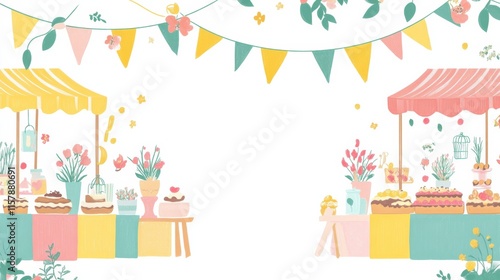 copy space, spring, market, stall, flower, decoration, vibrant, colours, celebration, treat, festivity, springtime, community, tent, plant, baking, sweet, bouquet, local, craft, food, gardening, colourful, joyful, happy, nature, seasonal, event, gathering, cheerful, banner, picnic, artisan, produce, hand-made, atmosphere, display, generative, ai