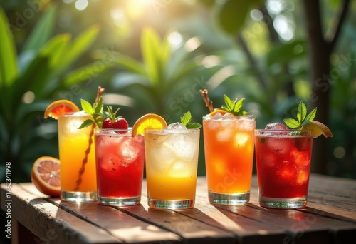 Vibrant Summer Patio Scene with Colorful Cocktails Under Bright Sunlight and Lush Greenery