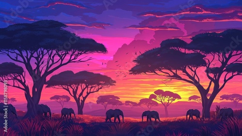 sunset, savanna, elephant, africa, landscape, nature, wildlife, animal, tree, sky, cloud, pink, purple, orange, yellow, dusk, evening, horizon, tranquil, peaceful, serene, majestic, wild, beauty, scene, view, background, image, illustration, art, digital, graphic, design, vibrant, colourful, warm, light, shadow, silhouette, calm, wilderness, habitat, safari, journey, adventure