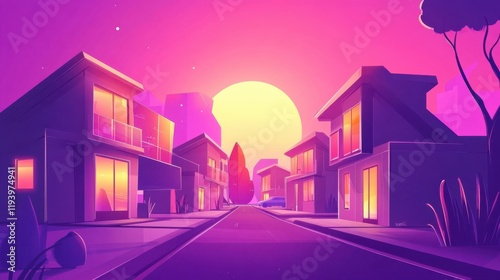 Vibrant Sunset Over Modern Houses in a Dreamy Cityscape, Featuring Soft Neon Colors, Dramatic Lighting, and Serene Atmosphere Capturing Urban Tranquility
