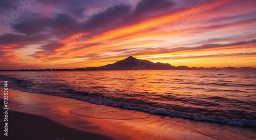 sunset, ocean, water, beach, sky, horizon, mountain, landscape, silhouette, orange, purple, gold, wave, calm, dusk, twilight, light, cloud, scenic, nature, evening, peaceful, serene, colourful, beautiful, travel, background, scene, environment, exterior, daylight, coast, sun, natural, calmness, visual, composition, wide, perspective, artwork, photo, digital, imagery, commercial, editorial, use