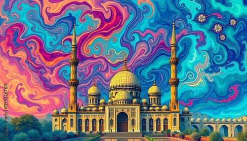 mosque, minaret, dome, architecture, islam, muslim, religion, prayer, faith, spirituality, swirling, vibrant, colourful, sky, cloud, abstract, art, design, paint, texture, colours, blue, turquoise, pink, purple, orange, yellow, gold, majestic, grand, beautiful, building, landscape, scene, image, illustration, digital, artwork, fantasy, dreamlike, surreal