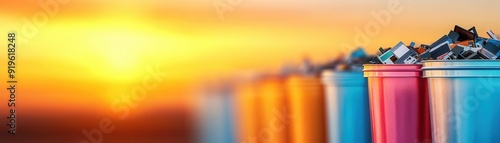 Vibrant trash bins lined up with a beautiful sunset in the background, showcasing colors and the importance of waste management.