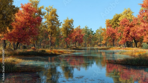 Vibrant trees in shades of red and orange surround a serene waterway showcasing the beauty of autumn. The scene reflects sunlight under a clear blue sky creating a peaceful atmosphere.