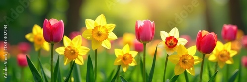 Vibrant tulips, daffodils, hyacinths burst with color against soft green spring grass , background, pink
