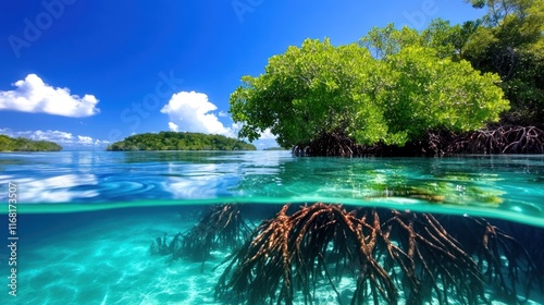 Vibrant underwater scene showcasing mangroves and clear waters.