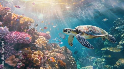 Vibrant Underwater Shot of Sea Turtle Swimming Among Coral Reefs and Fish with Sunlight Filtering Through Water