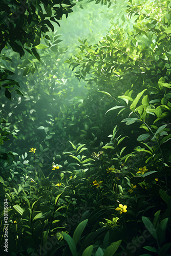 lush, verdant, landscape, foliage, green, wildflower, sunlight, canopy, shadow, untouched, natural, environment, tranquil, abundant, wilderness, harmony, tapestry, nature, vibrant, greenery, blossom, diverse, texture, shades, filter, contrast, setting, rich, abundance, calmness, flora, fauna, serene, forest, garden, biodiversity, natural beauty, flourishing