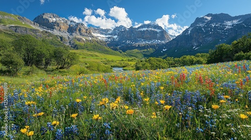 meadow, wildflower, mountain, snow, capped, peak, blue, yellow, orange, red, flower, spring, summer, landscape, nature, scenic, vista, vibrant, colourful, blooming, green, grass, vale, river, stream, rock, alpine, flora, vegetation, sunlight, cloud, sky, majestic, beautiful, tranquil, serene, wilderness, idylli, pasture, field, botany