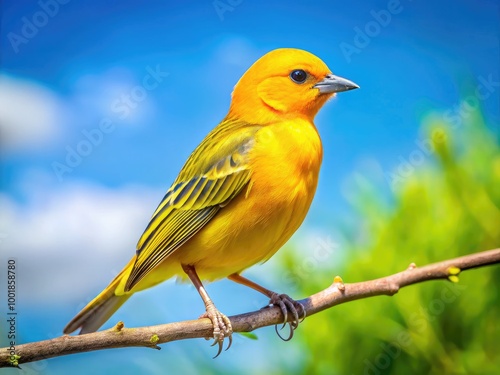 Vibrant Yellow Bird Sitting on a Branch Against a Soft Blue Sky in a Peaceful Natural Setting