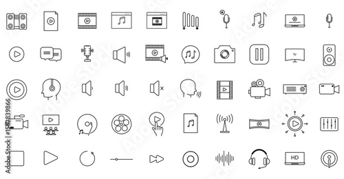 audio, video, icon, sound, music, speaker, microphone, multimedia, equalizer, set, editable, line, stroke, vector, illustration, modern, graphic, interface, element, web, app, digital, technology, media, device, volume, control, play, record, wave, visual, concept, symbol, flat, simple, design, communication, broadcast, studio, production, live, grooved, stream, podcast, earphones, mic, voice