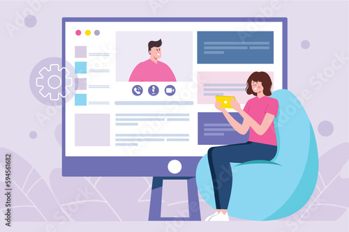 Video conference violet concept with people scene in the flat cartoon style. Businesswoman decided to hold an important meeting via video conference. Vector illustration.
