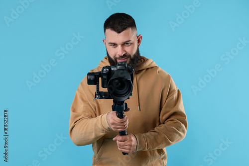 Videographer using gimbal stabilizer with camera on light blue background