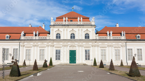Vienna, Austria - Jan 29, 2020: View on Schloss Unteres Belvedere, meaning Lower Belvedere Palace. Major tourist attraction of the austrian capital and an UNESCO World Heritage Site. Panorama format.