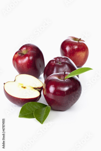 fruit, apple, crisp, fruit, apple, red, shiny, fresh, snack, diet, juicy, healthy, ripe, leaf, group, cross section, half, quite