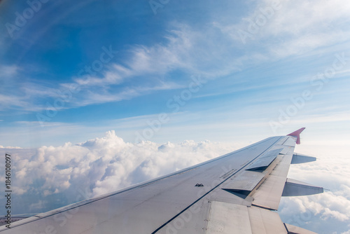 View from the airplane window at a beautiful cloudy sky and the airplane wing