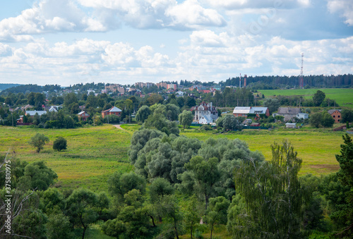 View from the hill to the fields, forest and village under a cloudy sky.