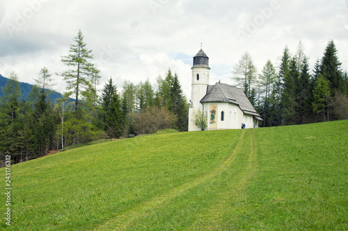 View of a small white church on a hill in the middle of a vibrant green alpine meadow in Ehrwald, Austria.