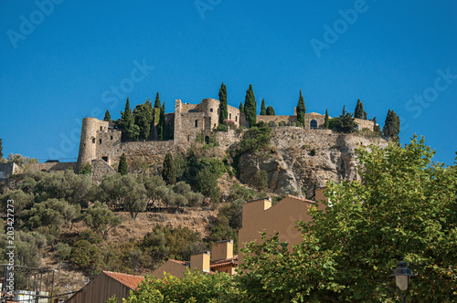 View of castle on top of a hill near the city center of Cassis, a beautiful and sunny seaside town with harbor. Located in the Bouches-du-Rhone department, Provence region, southeastern France