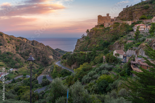 View of Chiesa di San Nicolo Church overlooking town of Savoca at sunset, Savoca, Messina, Sicily, Italy, Mediterranean, Europe