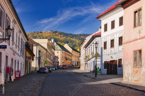 architecture, autumn, autumn landscape, building, car, city, cobbled, daytime, europa, facades, hill, historic, historical, historical building, lamp-post, pastel, perspective, road, sky, slovakia, street, street scene, tour tourism, town, city landscape, travel, tree, urban, urban scene, view