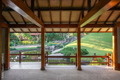 View of Japanese garden from inside house with natural sun lights and environment background.