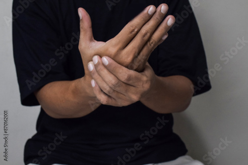 View of Man massage on fingers to relief pain from hard working for treatment gout and rheumatoid symptoms and chronic illness with little blurry