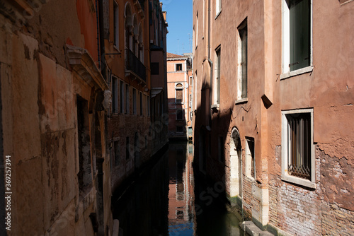 View of the water channels, bridges and old palaces in Venice at sunrise during the lockdown