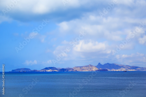 yemen, sea, water, wave, blue, deep, water surface, coast, littoral, shore, waterside, waterfront, mountain, rock, stone, cliff, crag, sunny day, south, city, landscape, scenery, view, horizon
