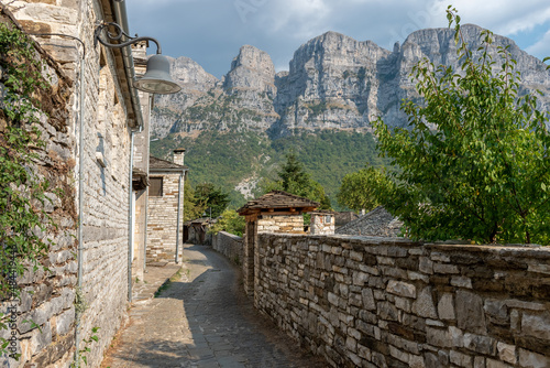 view of traditional architecture with stone buildings and background astraka mountain during fall season in the picturesque village of papigo , zagori Greece