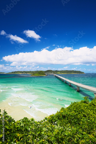 landscape, japan, bridge, way, route, island, sea, beach, beach, emerald green, blue skies, sunny, cloud, tourist attraction, copy space