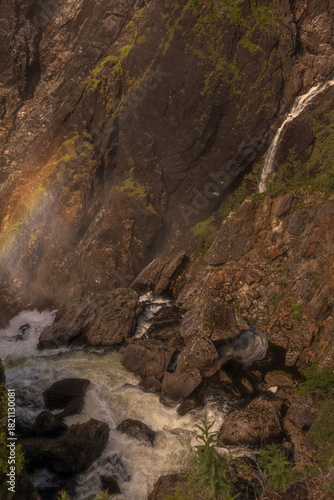 nordic, dramatic, scandinavian, powerful, northern europe, rainbow, attraction, national, cascade, moss, panorama, spectacular, summer, europa, stone, mountain, stream, norwegian, tour tourism, sky, green, outdoors, travel, beautiful, scenic, canyon, rock, scenery, mountain, scandinavia, water, river, vale, view, nature, landscape, waterfall
