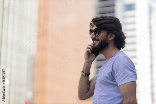 View of young man using a smartphone at day time with city view landscape in the background. High quality photo