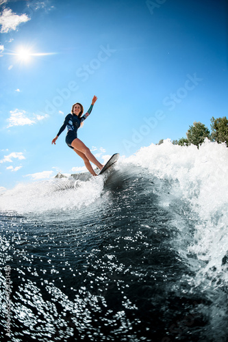 view on beautiful smiling woman actively ride surfboard on the wave