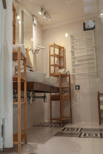 bathroom, interior, modern, contemporary, sink, ceramic, white, wooden, shelf, mirror, glasses, door, bright, elegant, clean, spa, aesthetic, domestic, home, decor, storage, organisation, neat, comfortable, design, stylish, hygiene, towel, cosy, furniture, decoration, luxury, household, fixture, sanitary, functional, neutral, architecture, lifestyle, relaxation, sink, double, wood, shelf, hotel, wellness, beauty, washroom, cleaning