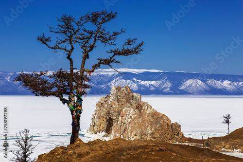 View to the Shamanka rock and a wishing tree on cape Burhan of Olkhon island on lake Baikal. Irkutsk region, Russia