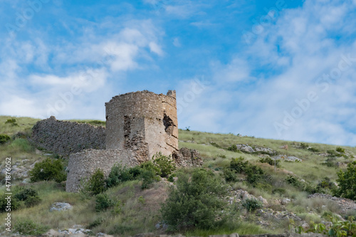 View tower of Chembalo fortress. Medieval architecture monument, landmark. Ruined stone Genoese fortress in Balaclava in Crimea