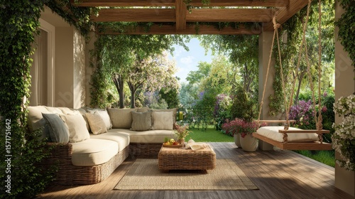 Villa patio with rattan coffee table, large sofa and wooden garden swing, no logos, no brands