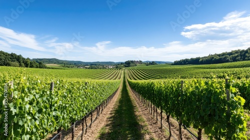 Vineyard landscape panorama with rows of grapevines and a distant winery